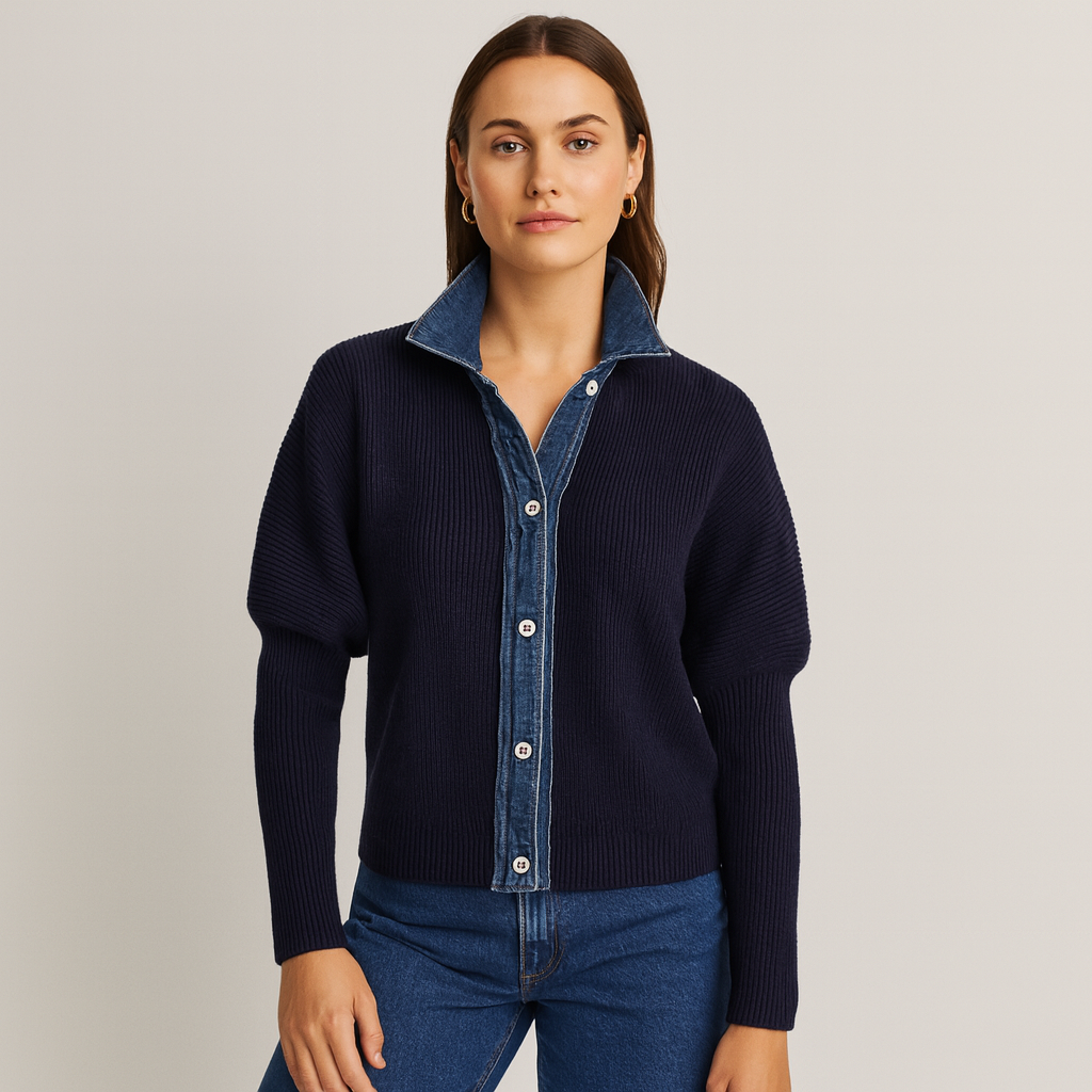 Navy Cardigan in Knit with Denim Finish