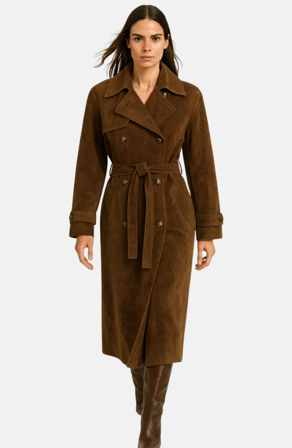 A synthetic suede trench coat designed as a fashion investment, timeless and always elegant.