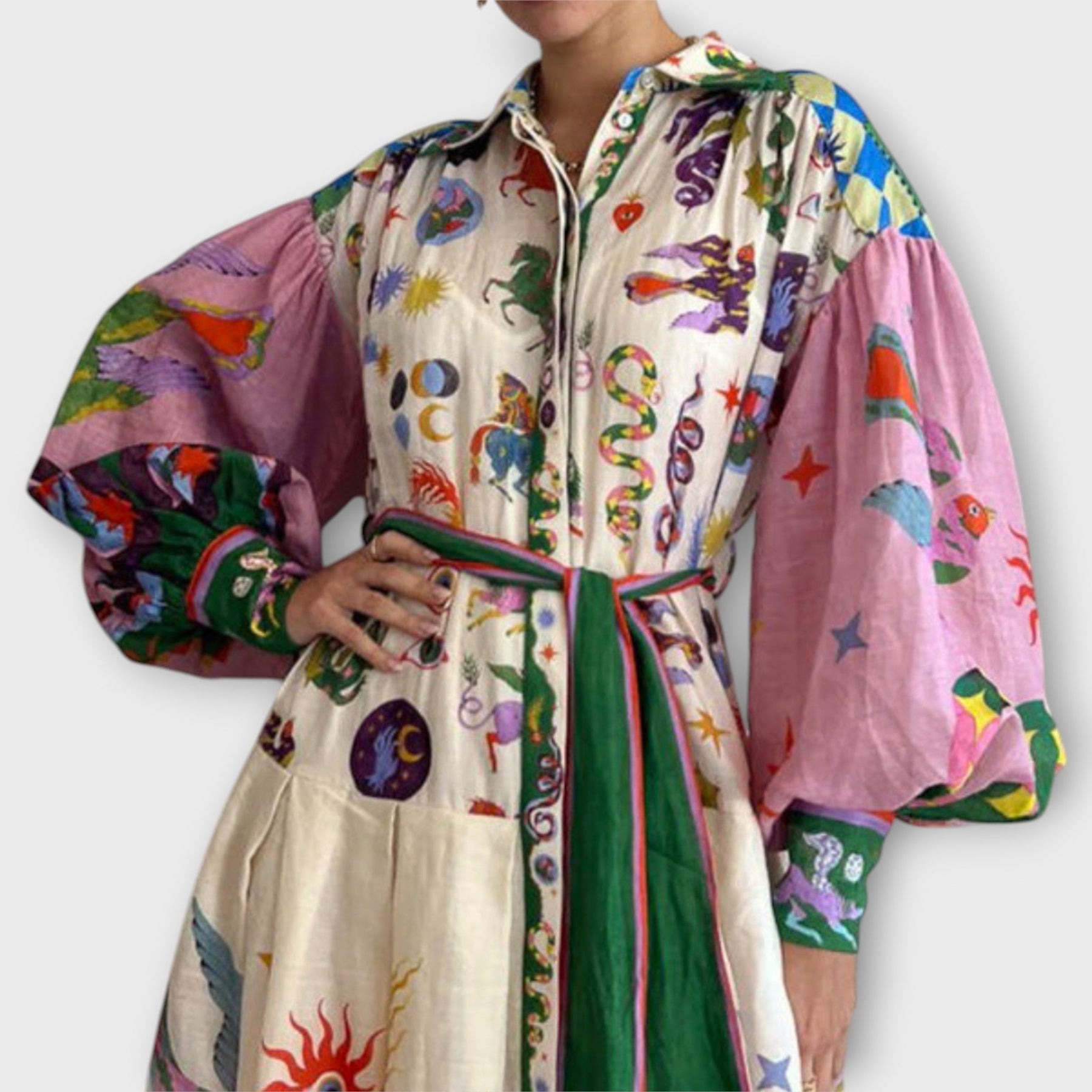 • Wide puff sleeves: Add volume and character to the ensemble.